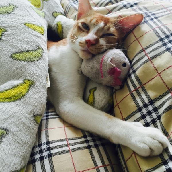 1) Aiko the cuddle-master with his little toy friend. That's some master-level snuggling...